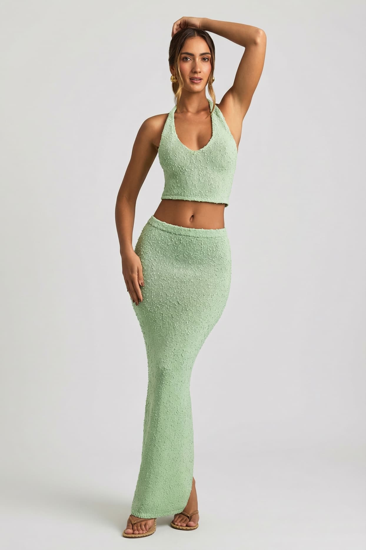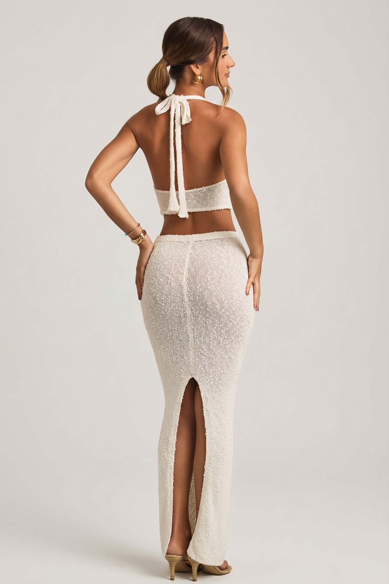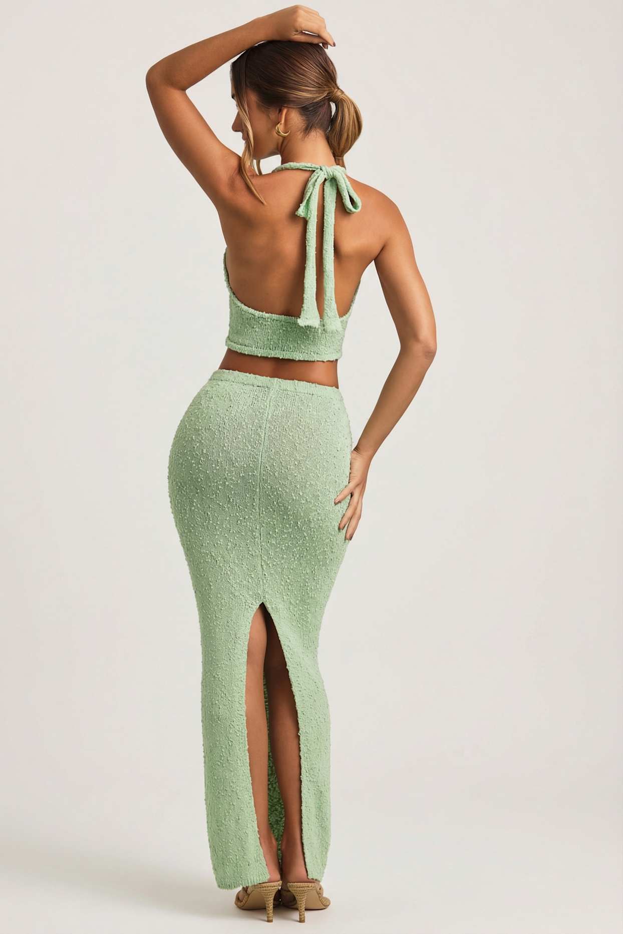 Made from premium, subtly sheer and stretchy bouclé knit fabric. Unlined.