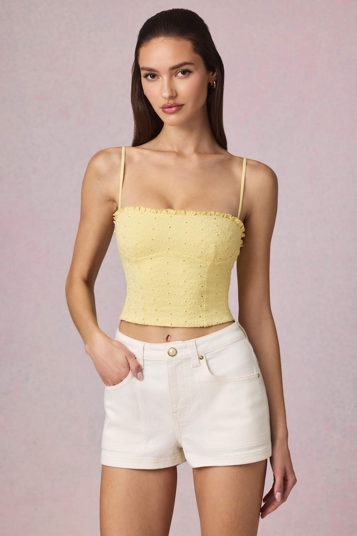 Premium cotton broderie anglaise with a touch of stretch for comfort. Features a soft modal jersey lining for a smooth feel against the skin.