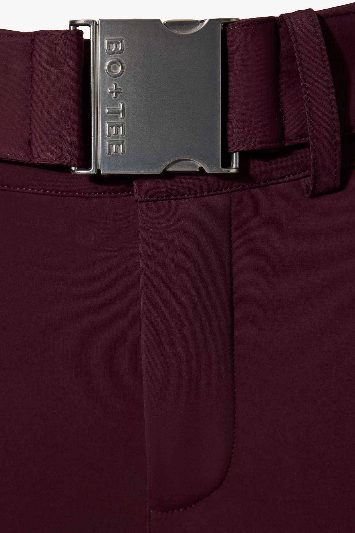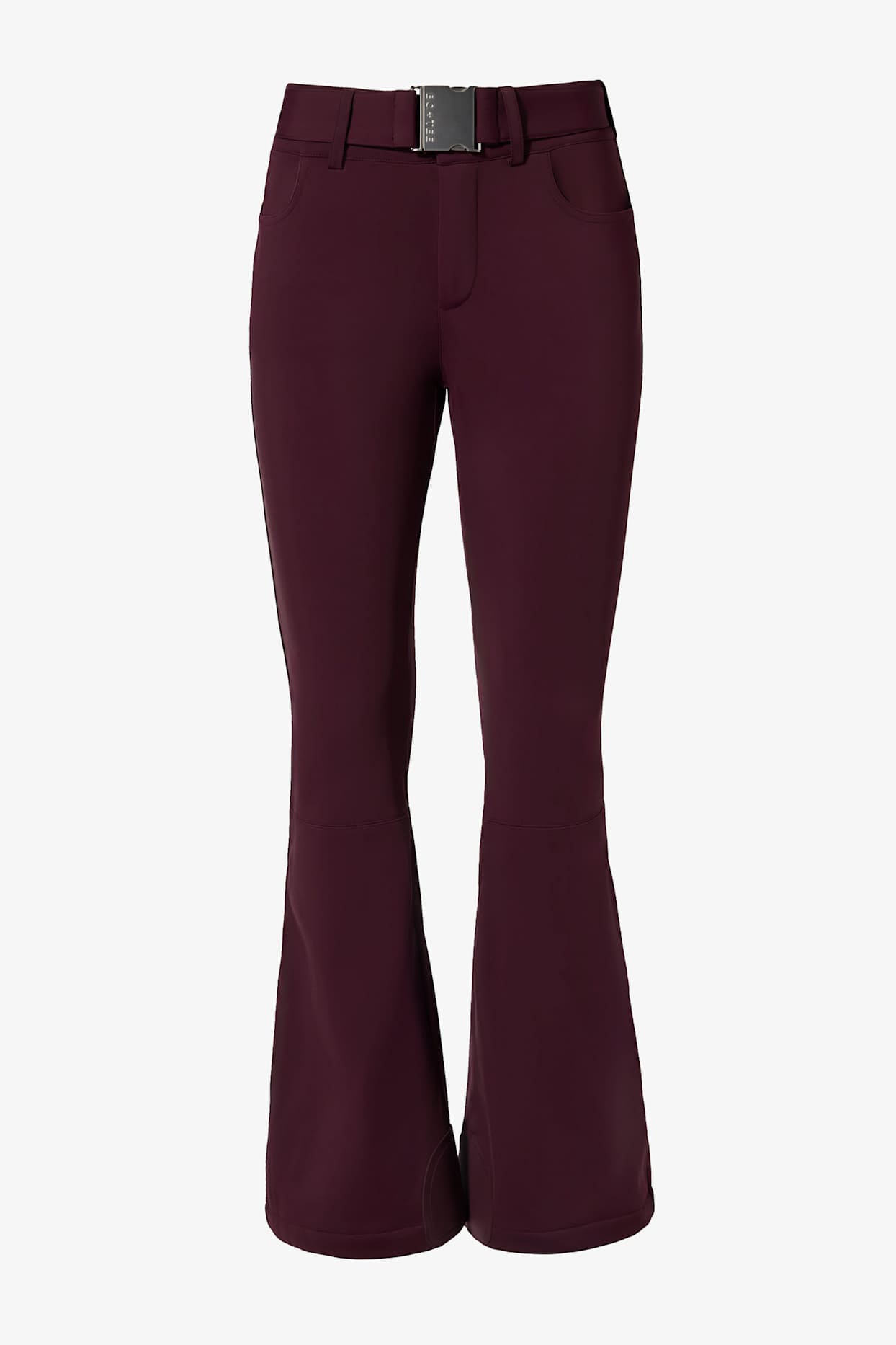 Features a belted buckle, front pockets, and flared legs with zipped hems.