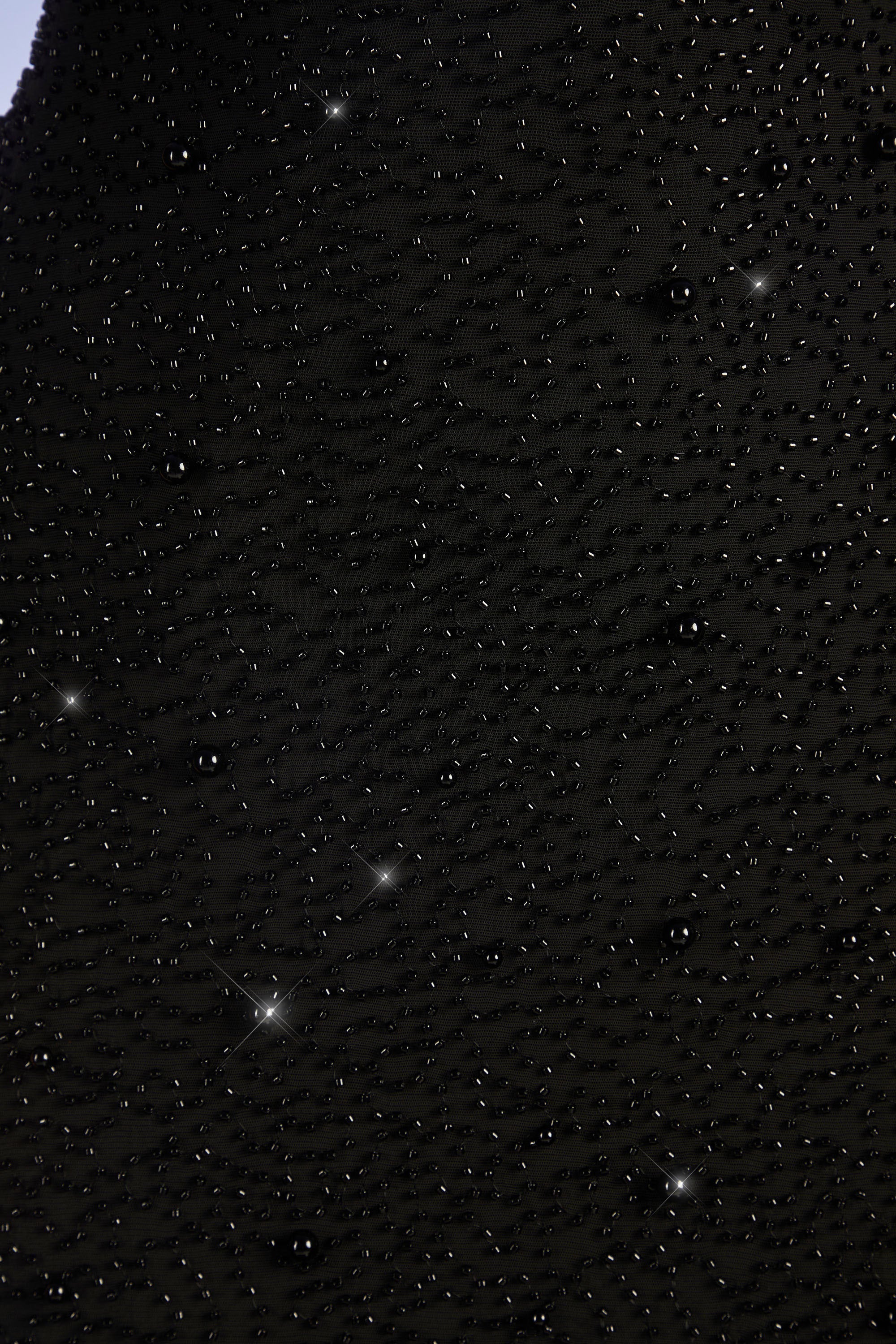 Premium jersey fabric with hand-sewn pearl and bead embellishment. Fully lined for comfort and structure.