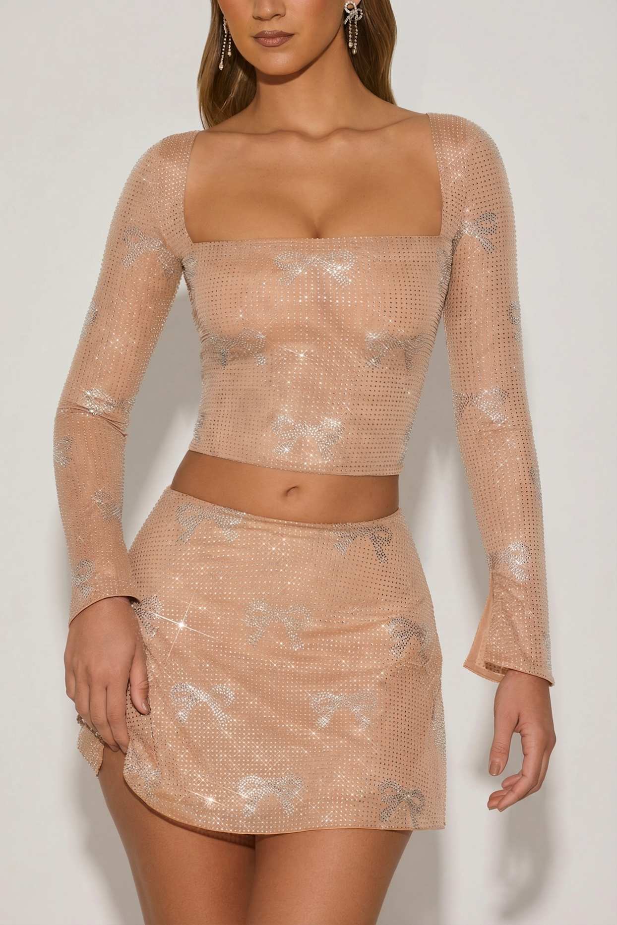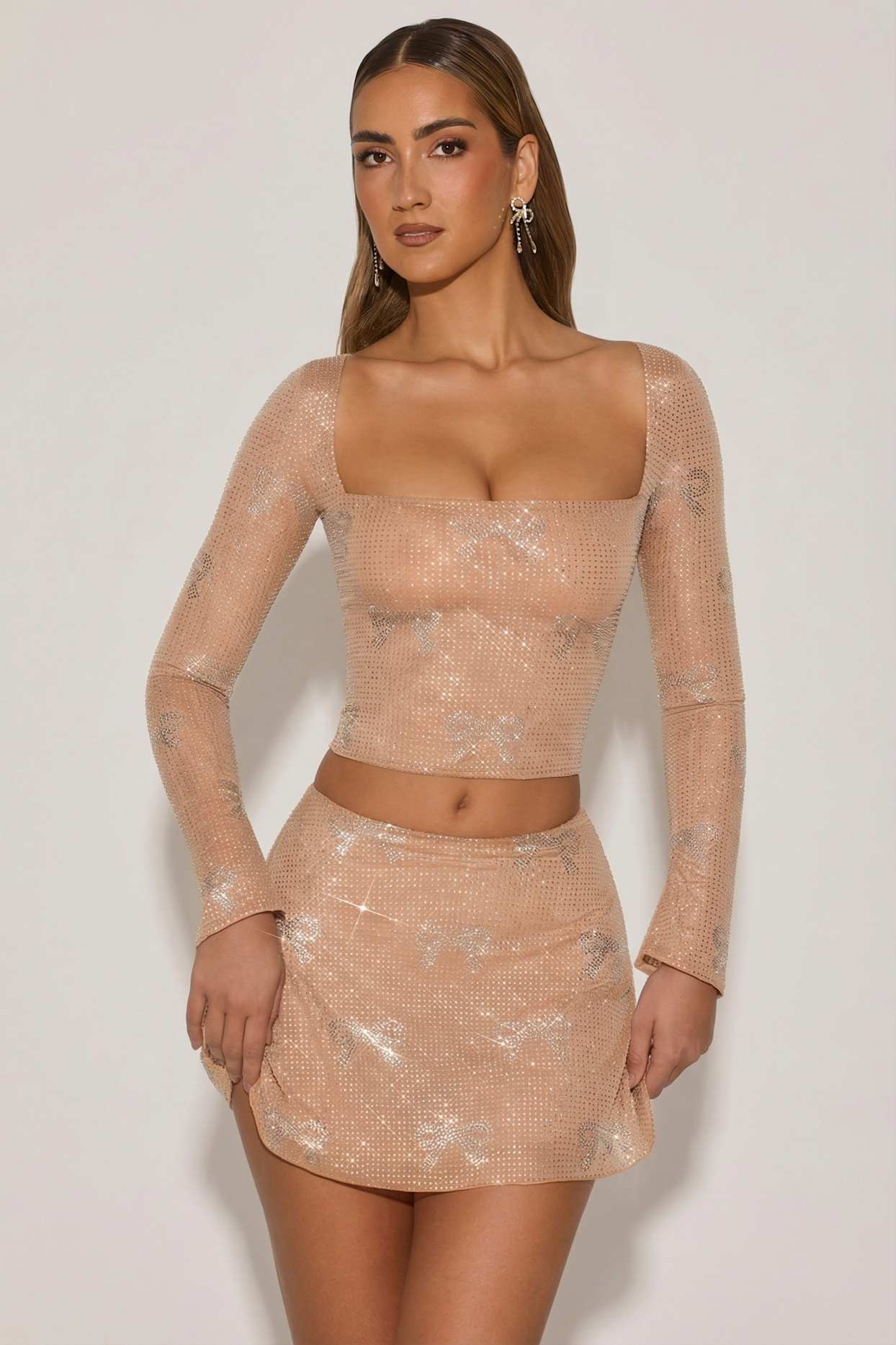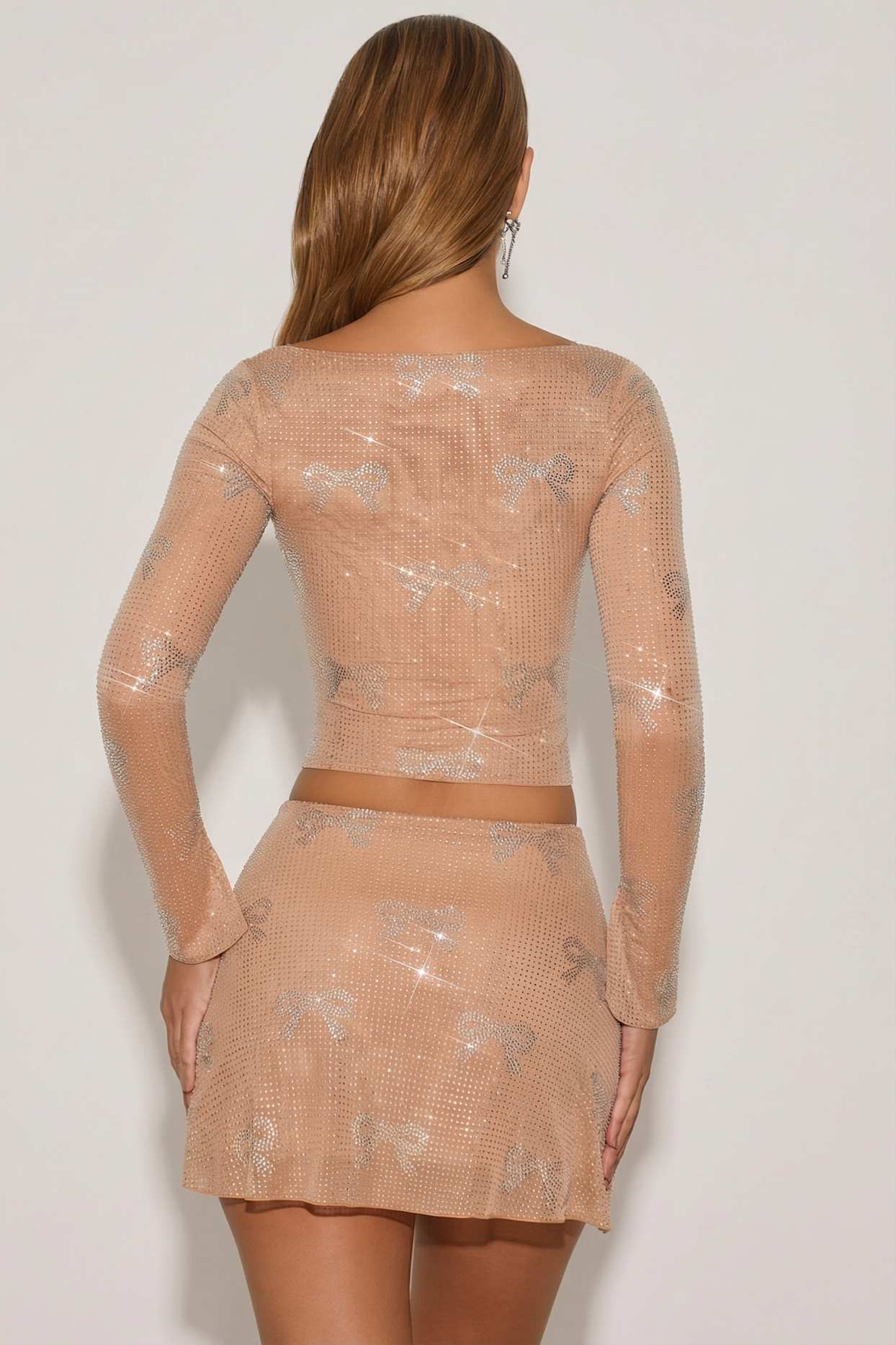 Premium double-layered stretch mesh with a soft mesh lining and all-over sparkling embellishments.