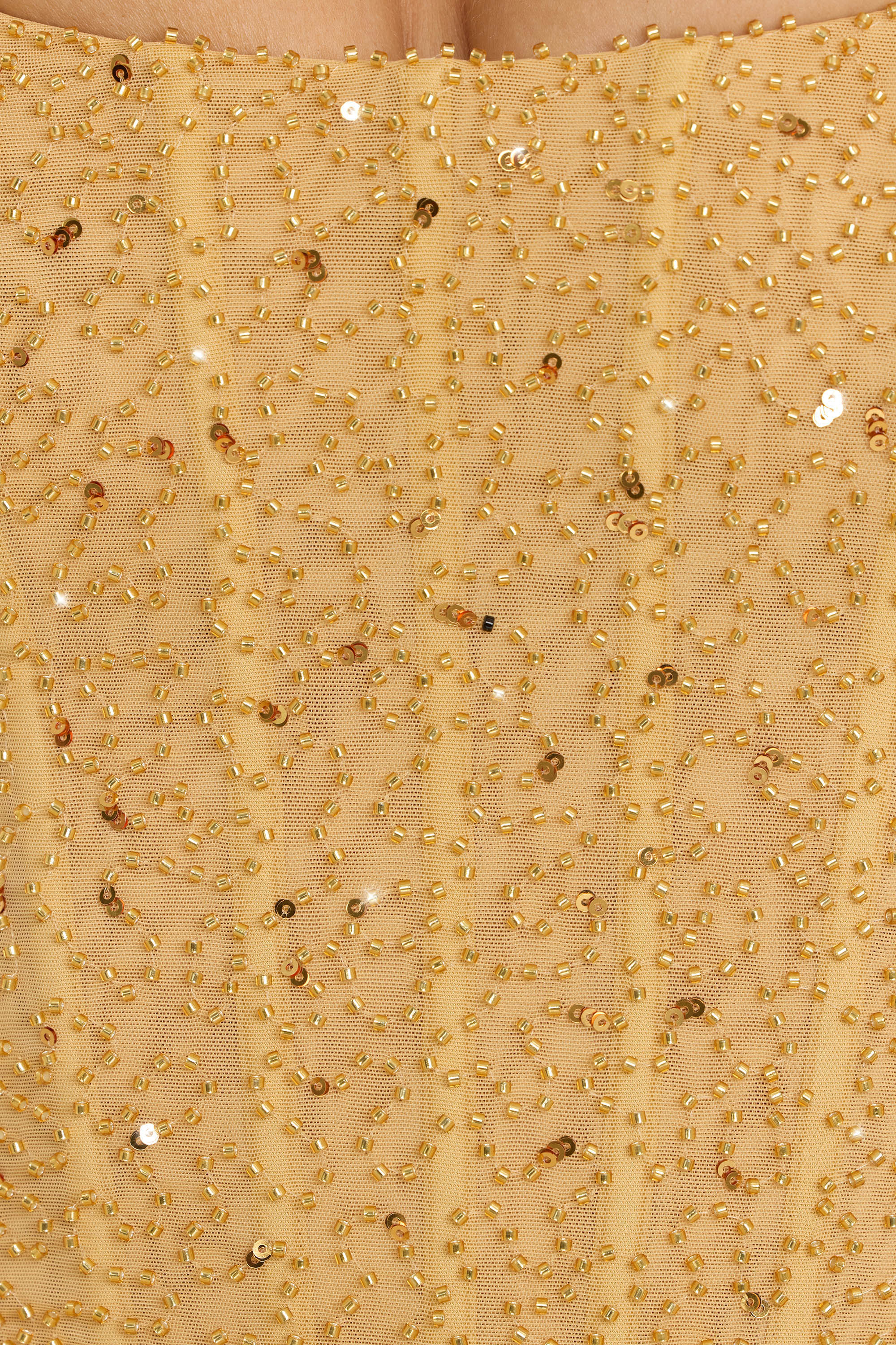 Premium power mesh corset with delicate artisanal hand embellishment throughout (Shell: 100% Nylon, Lining: 94% Polyester, 6% Elastane). Woven tulle skirt with jersey lining. This garment contains delicate artisanal hand embellishment and it is normal that overtime embellishment may become loose. Additional embellishment has been provided for repairs.