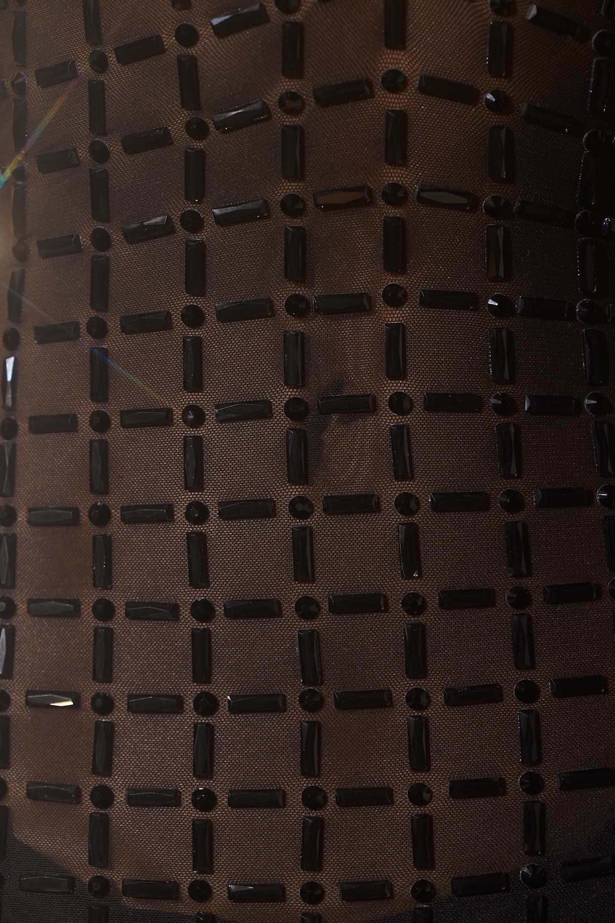 Premium semi-sheer stretch mesh with all-over high-shine square embellishments in a custom grid pattern.