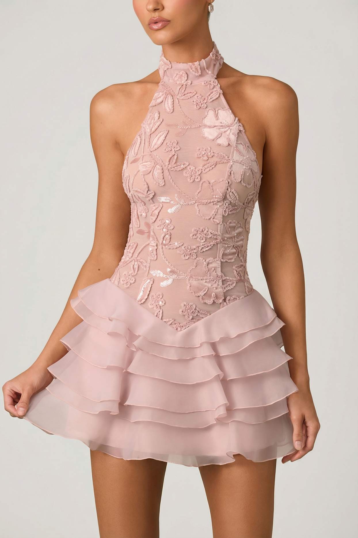 Premium velvet mesh bodice with flocked floral appliqués and sequin embellishments. Tiered ruffle skirt in organza with a stretch lining.