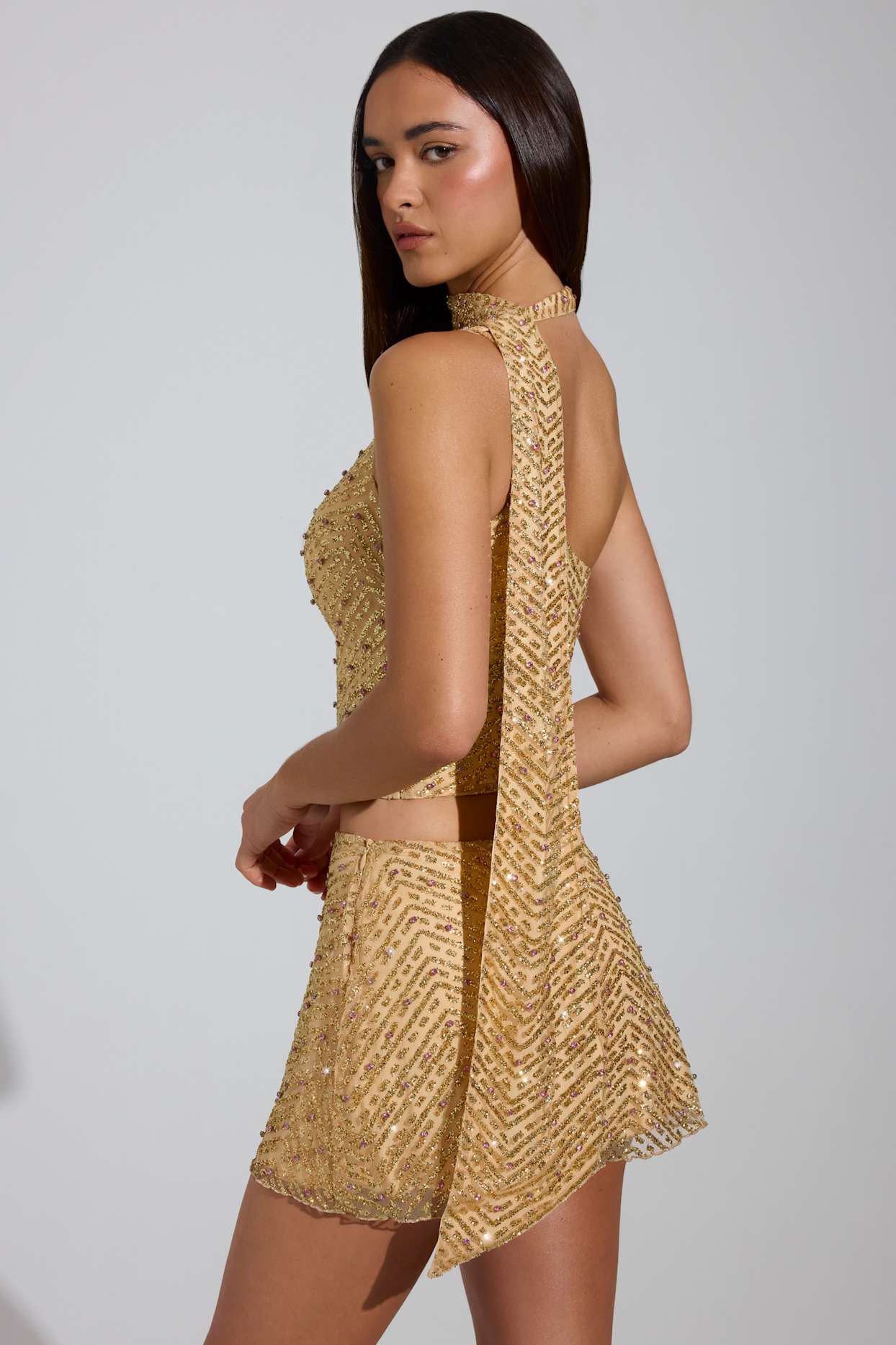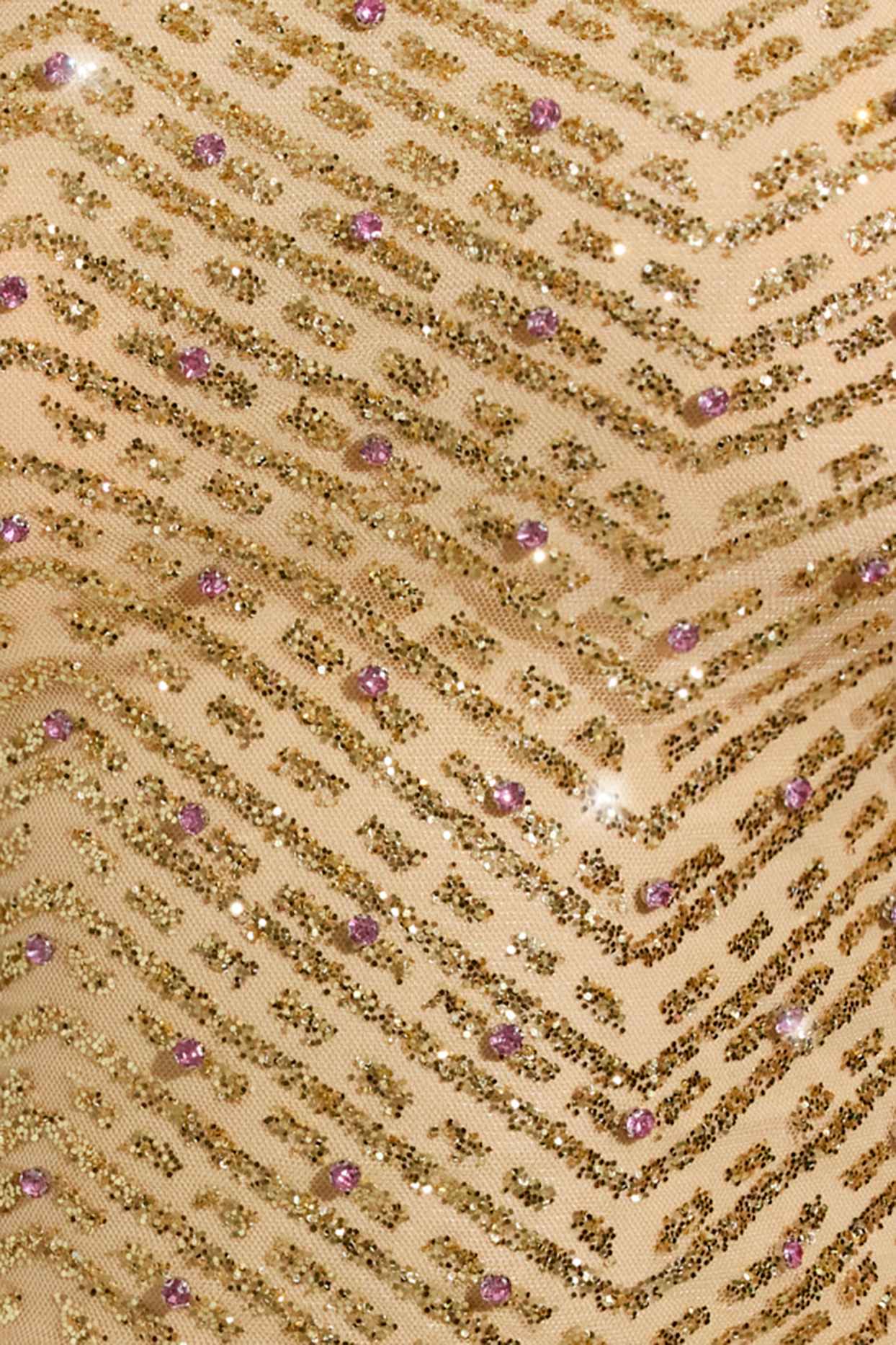Premium lightweight glitter mesh with a soft, stretchy jersey lining. Fully lined and embellished with three-dimensional beads and contrasting pink diamantés.