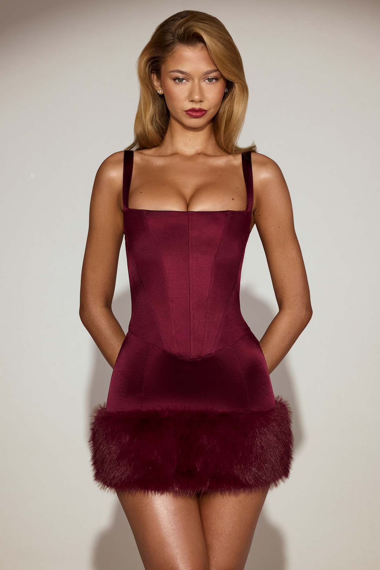 Premium satin jersey with a soft faux-fur trim at the hem. Fully lined for comfort and structure.