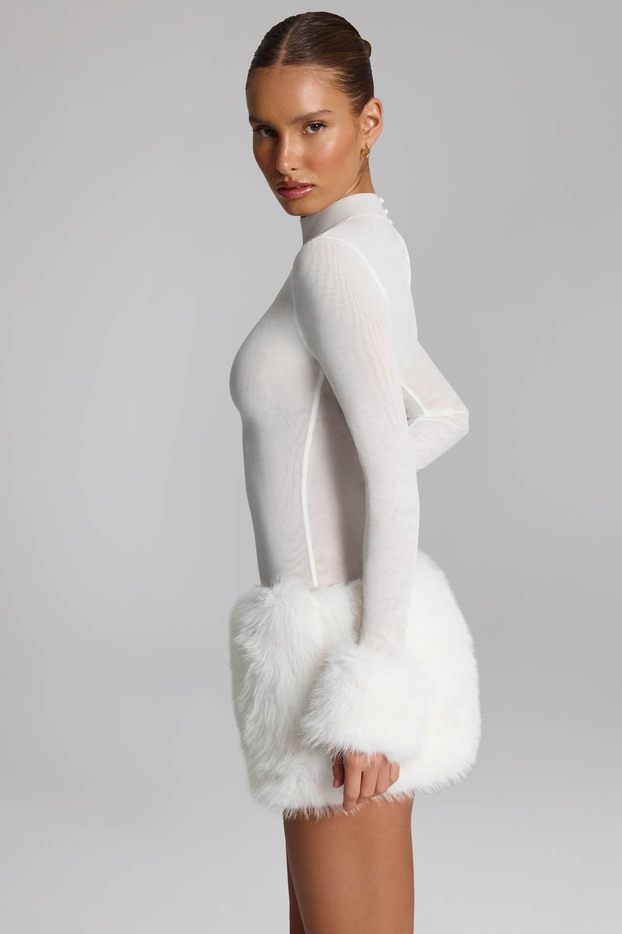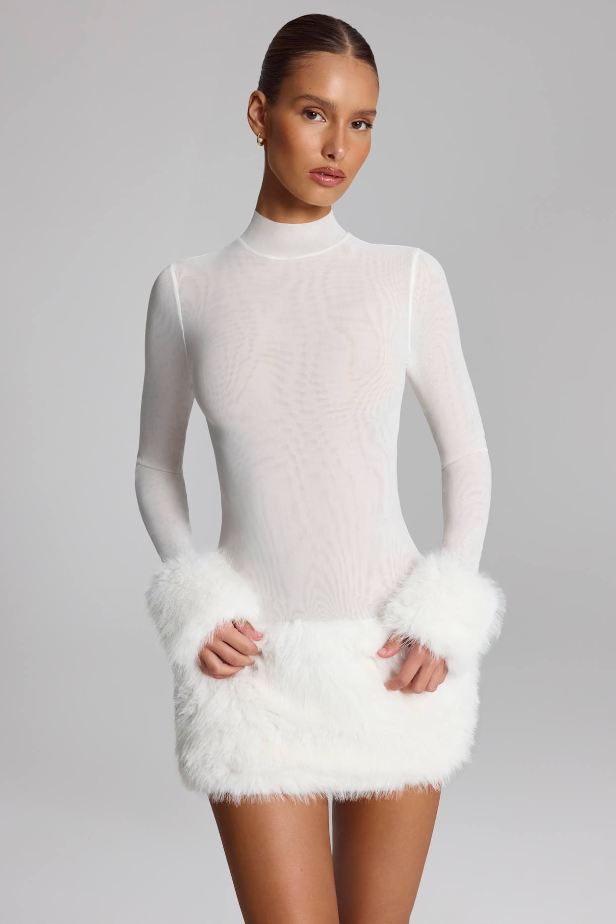 • Made from premium semi-sheer mesh with a faux fur trim. Partially lined.