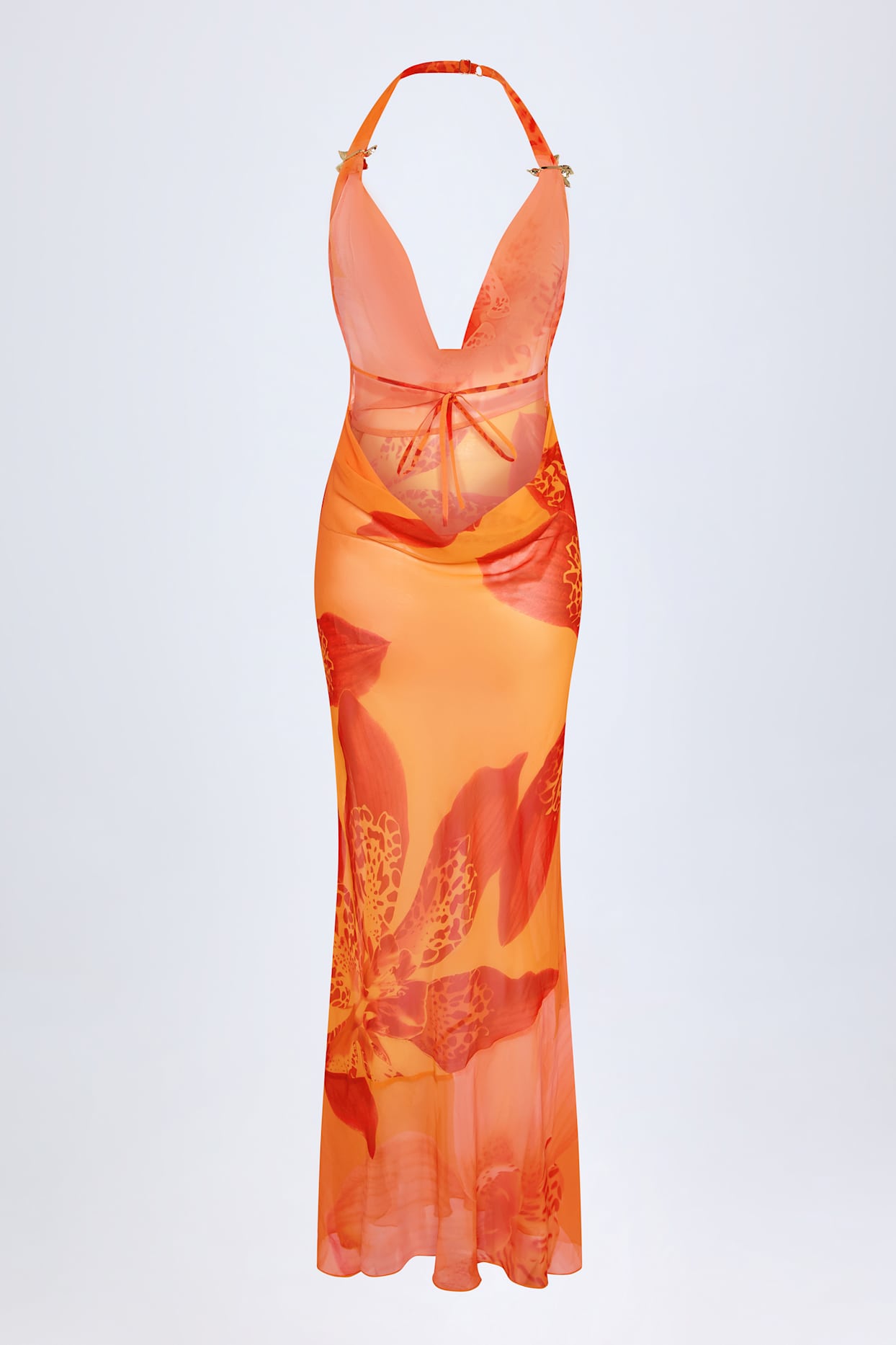 Cut from airy, fluid chiffon with a semi-sheer finish and floral hardware detailing.