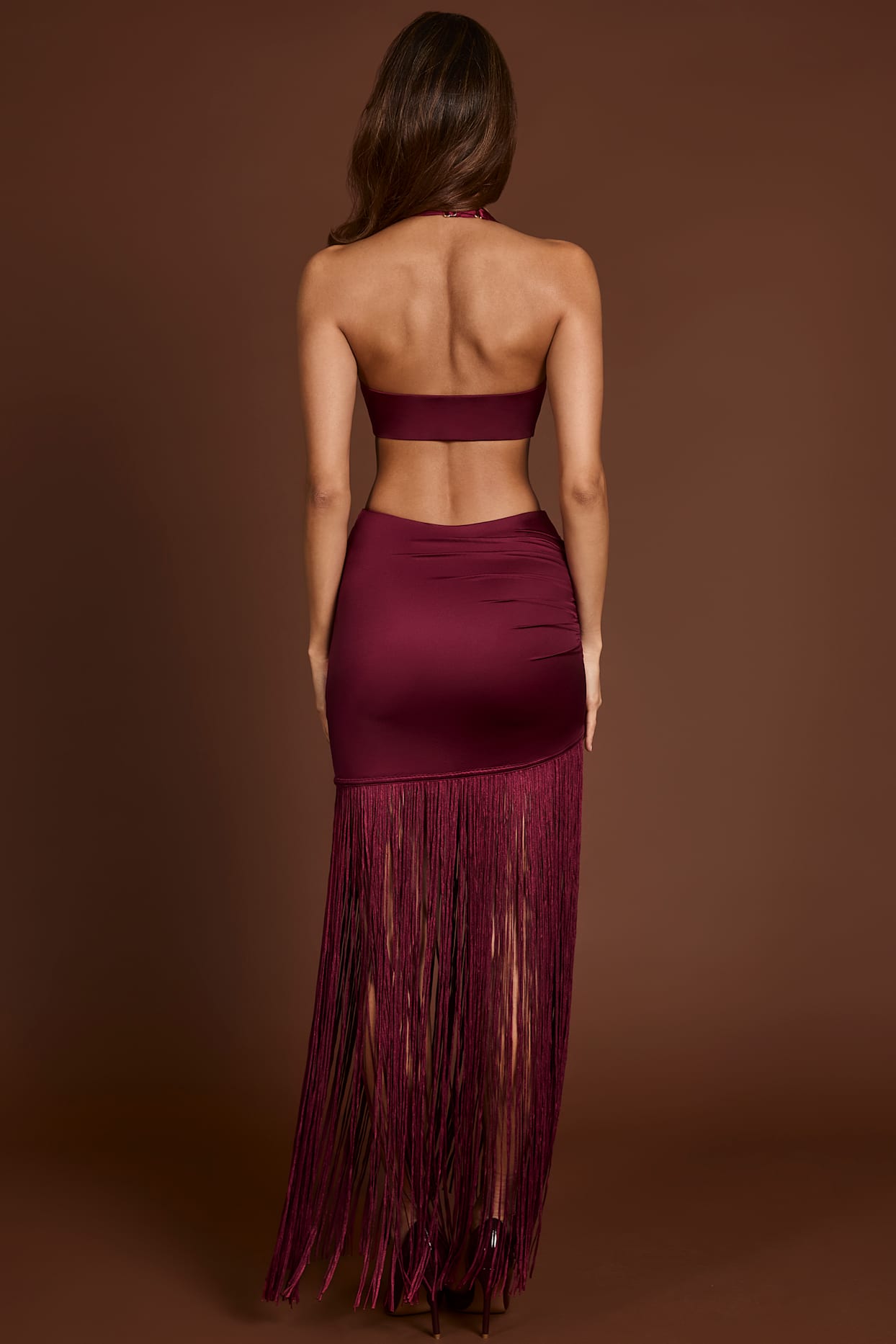 Style with a sleek clutch and a bold lip for a complete evening look.