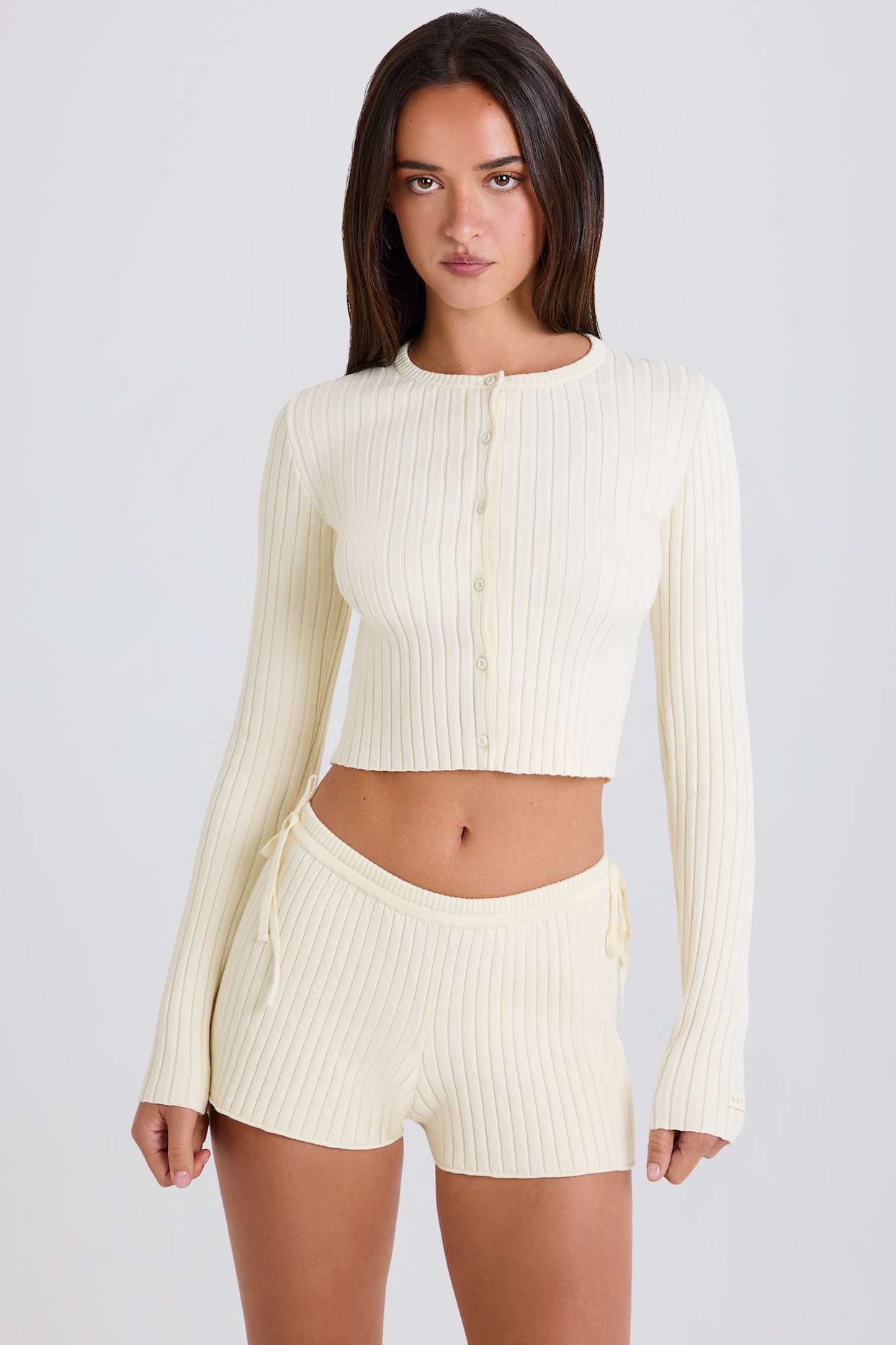 Soft and stretchy ribbed-knit fabric made from a cotton blend for lightweight comfort.