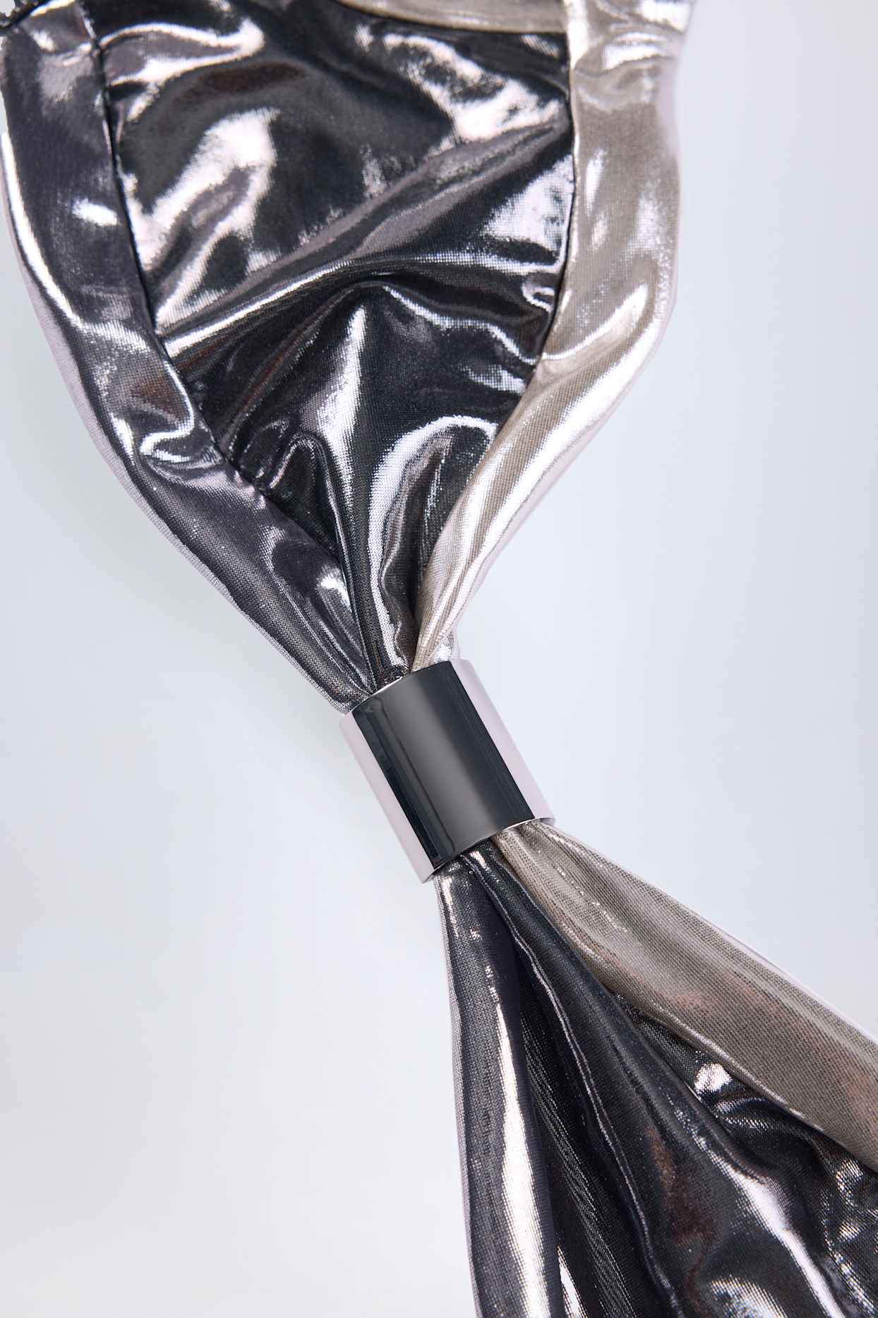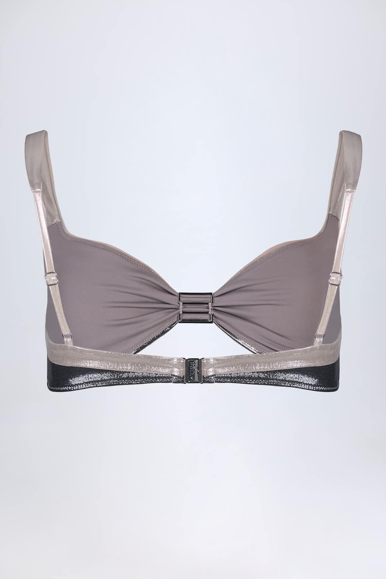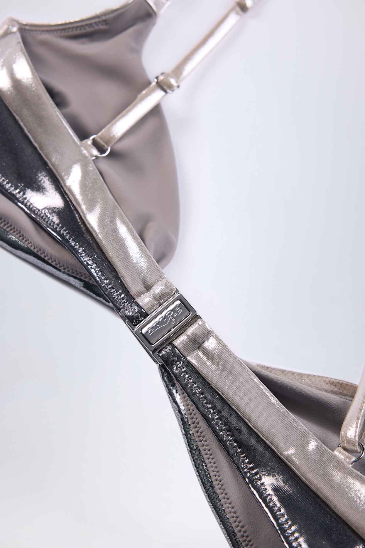Premium foiled-jersey swim fabric with a soft jersey lining and full lining for comfort.
