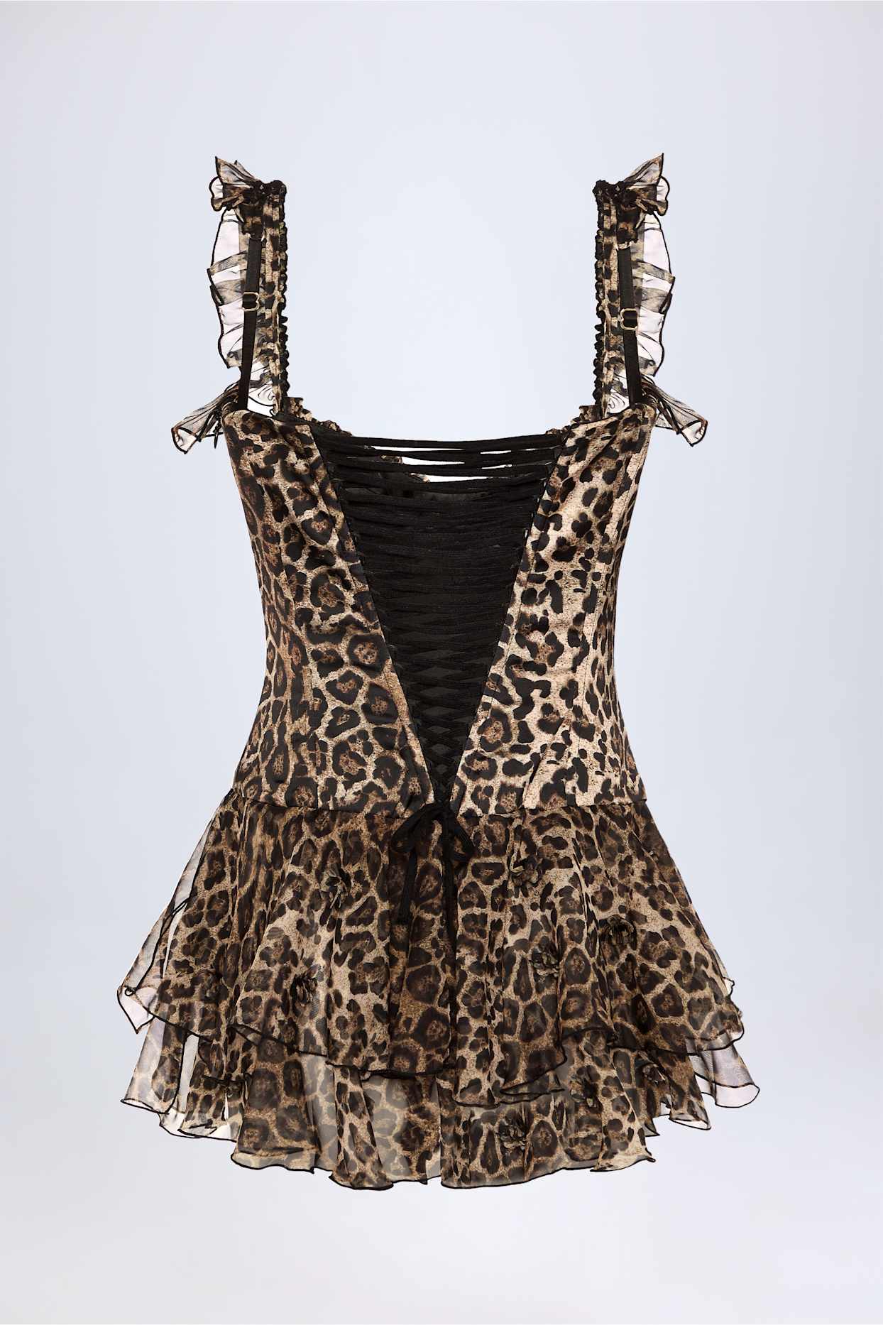 Features a layered chiffon overlay and ruffled trims for a textured look.