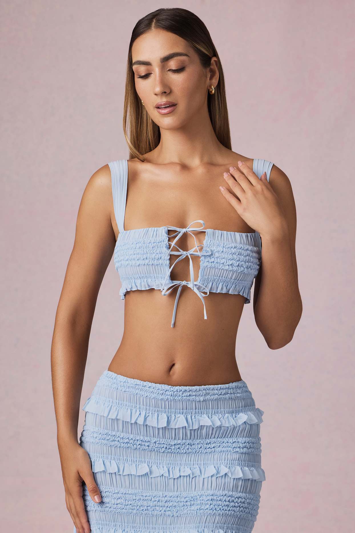 Premium semi-sheer textured mesh with delicate ruffle trims. Fully lined for comfort and coverage.