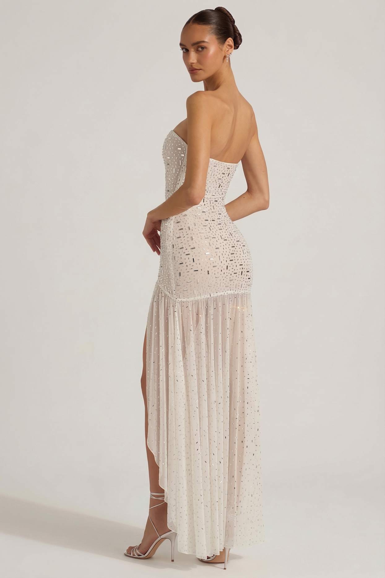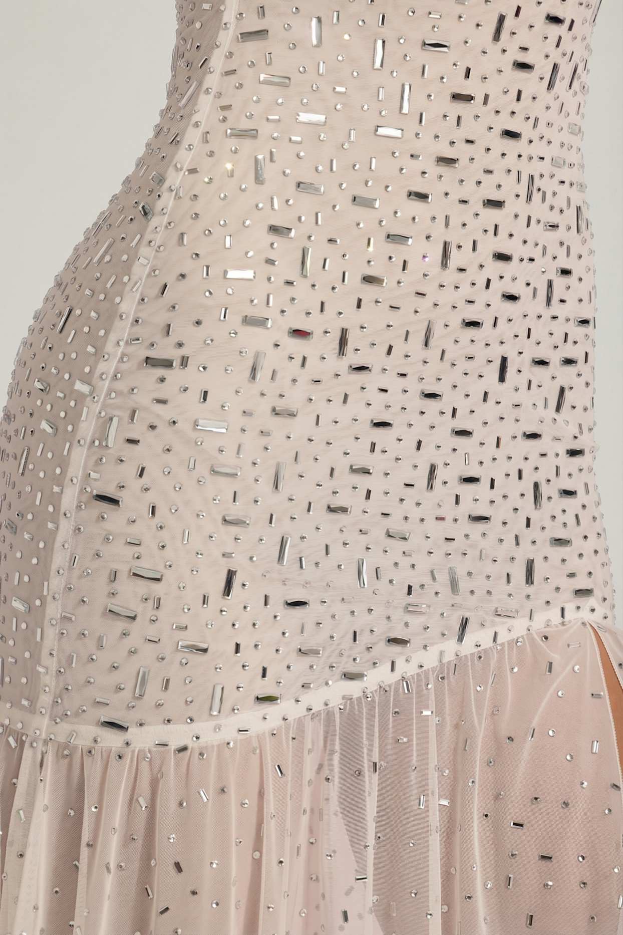 Crafted from premium dual-layered stretch mesh with a full lining, featuring a fitted bodice and a sheer asymmetric skirt.