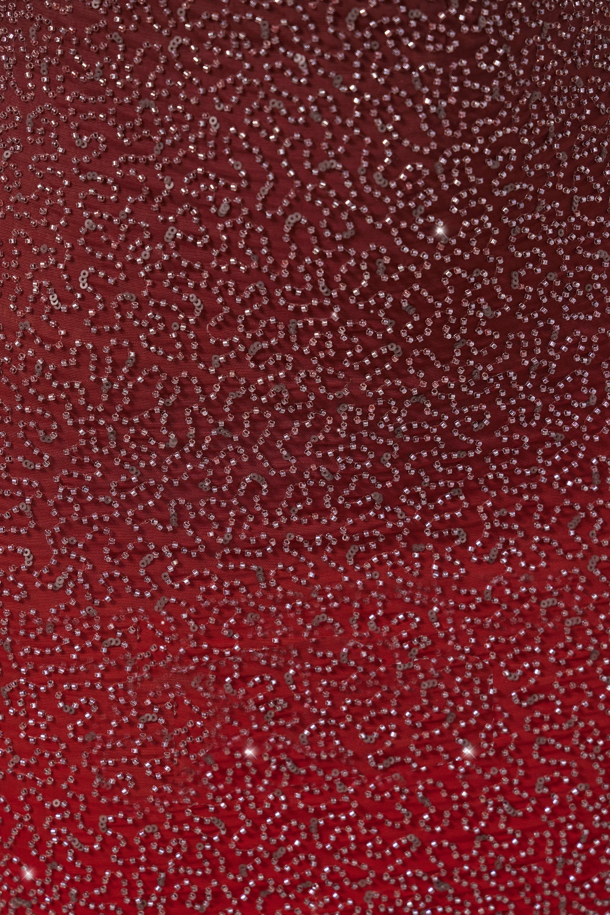 Dual layered mesh fabric with fully seeded sequin and bead embellishment throughout. Shell is a blend of polyester and elastane, fully lined for comfort. Contains delicate hand embellishment.
