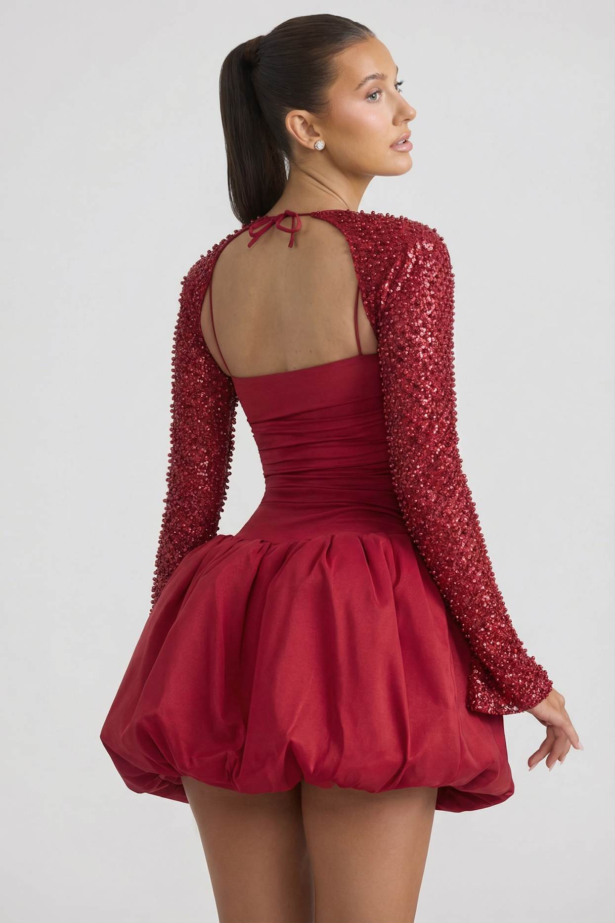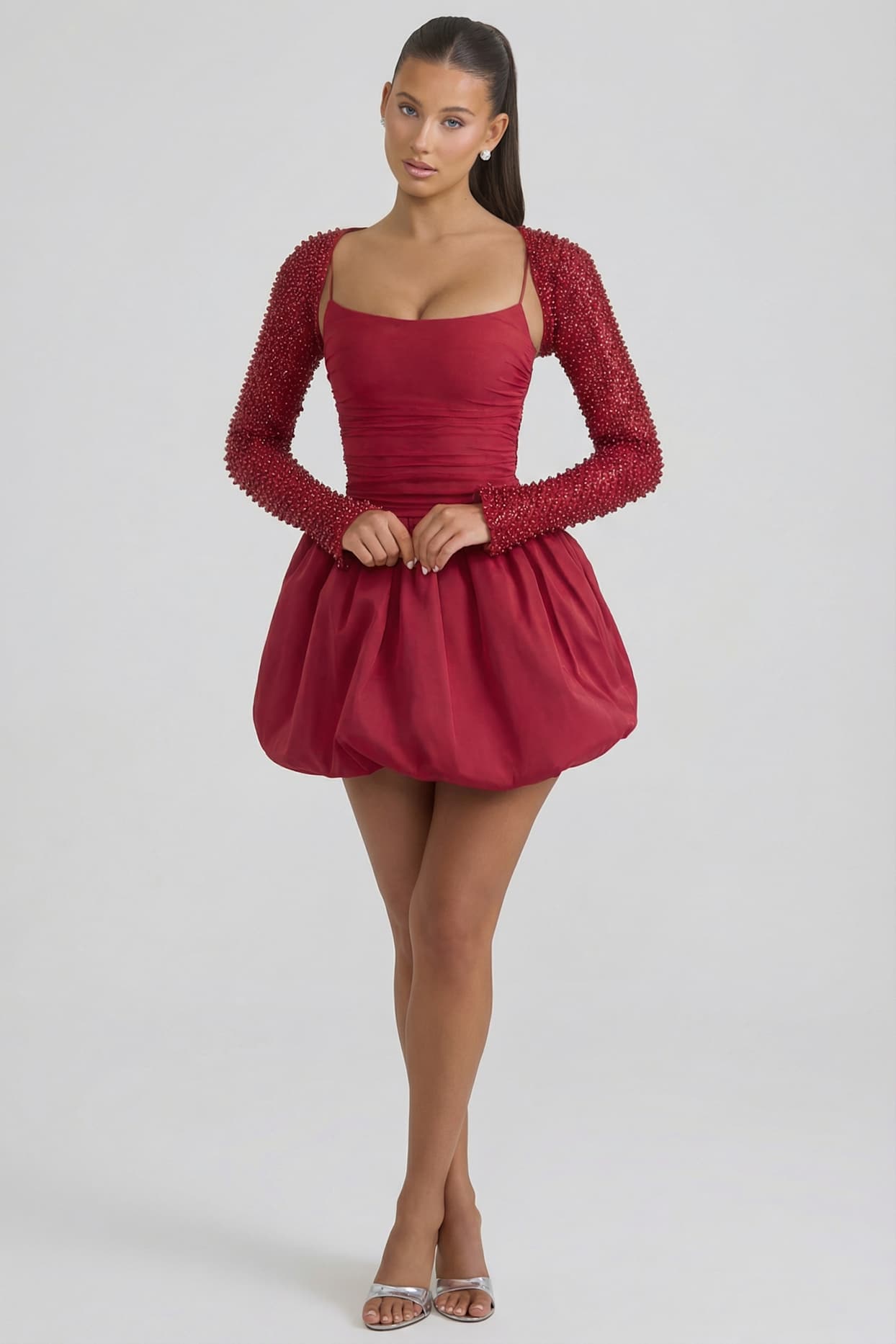 Detachable long-sleeve shrug with glitter and bead embellishment.