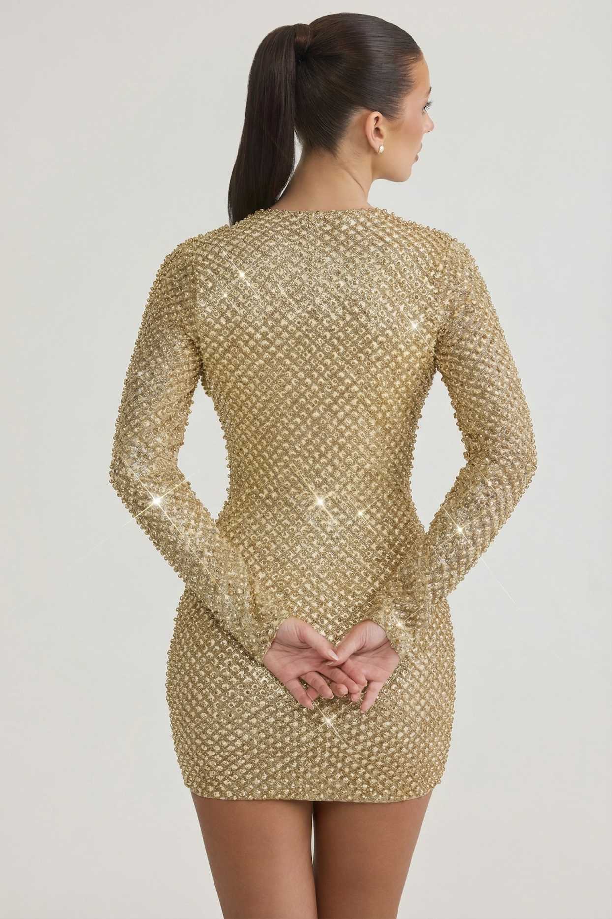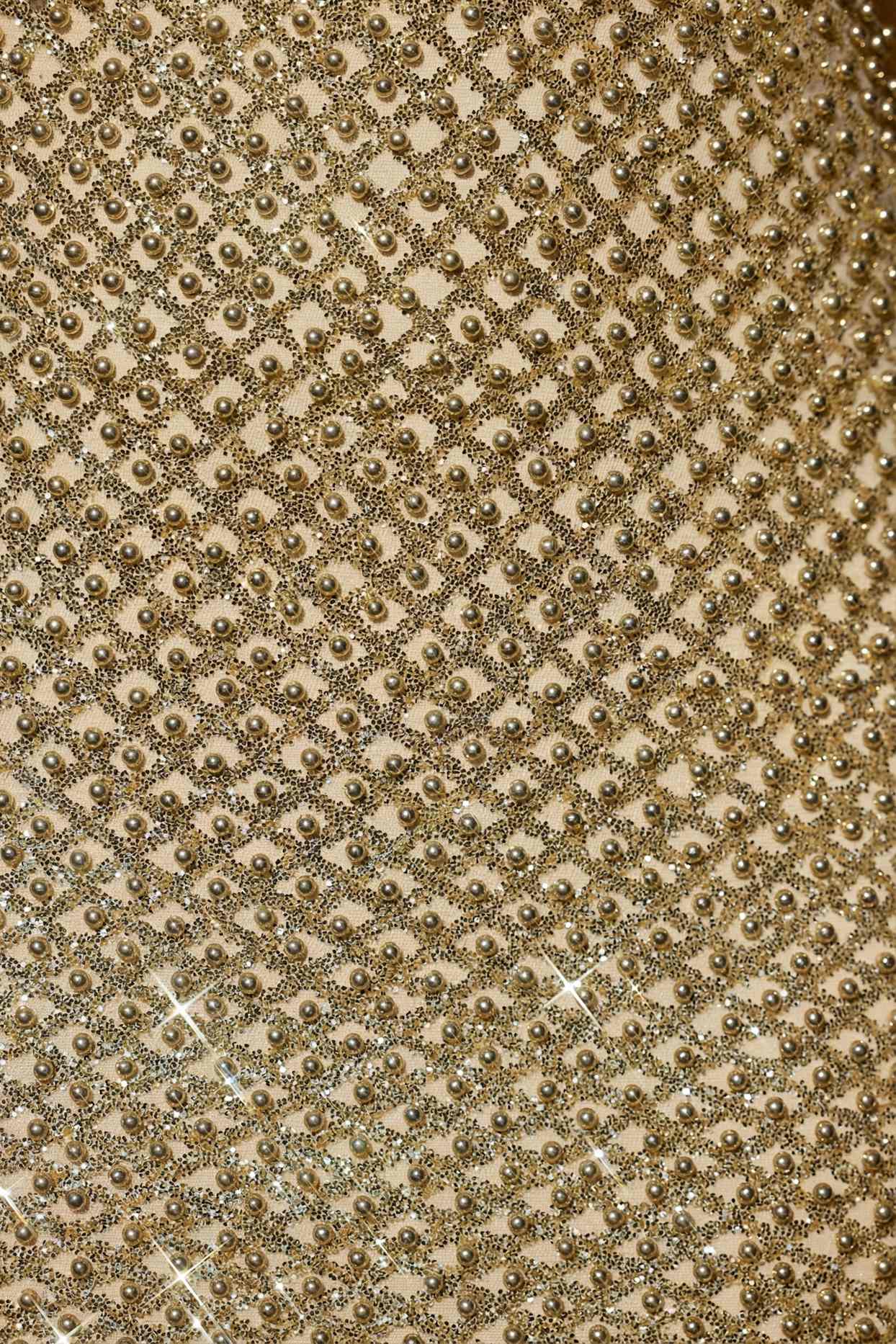 Made from premium glittered mesh with a stretch jersey and mesh lining (Shell: 100% Polyester, Lining1: 95% Polyester, 5% Elastane; Lining2: 82% Polyester, 18% Elastane). Fully lined.