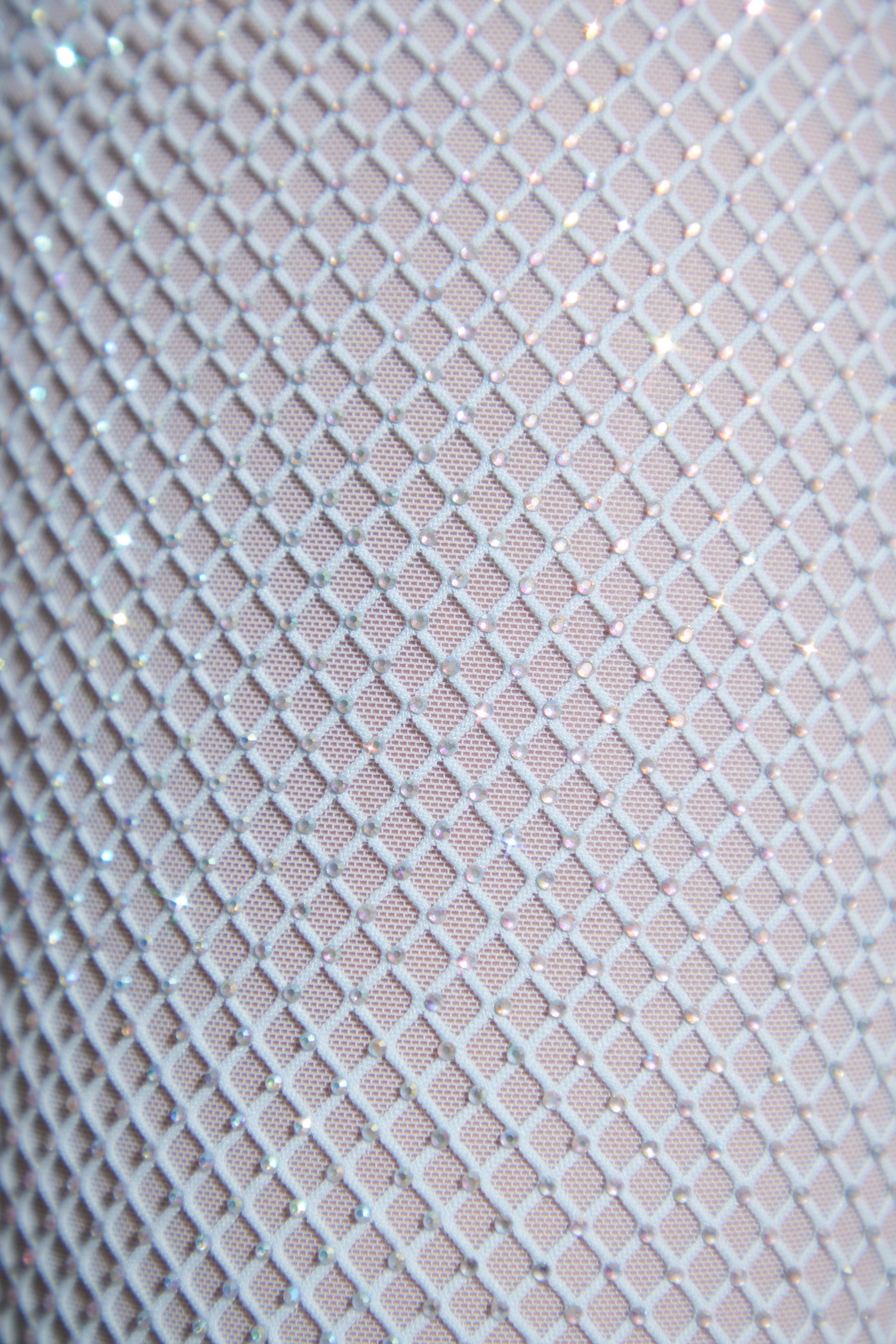 Stretch mesh and embellished fishnet fabrication with sparkling rhinestone details throughout.