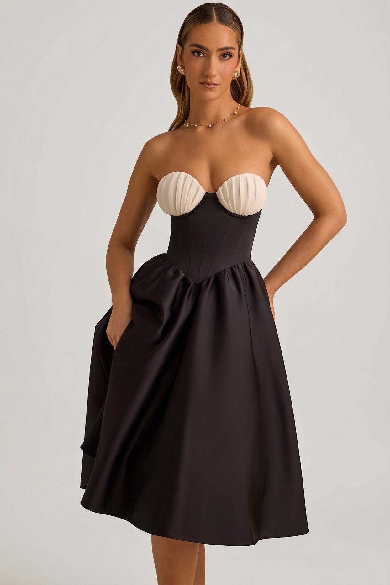 Made from premium non-stretch bonded satin with an organza inner layer and stretch-satin and mesh lining. Fully lined for structure and comfort.