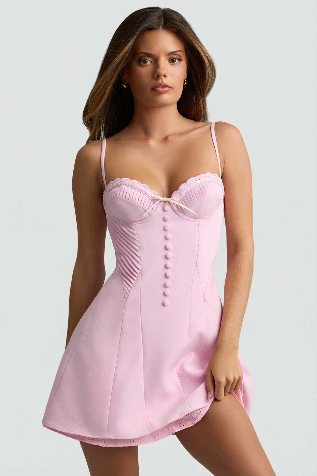 Made from premium stretch satin with a soft, smooth finish and a delicate broderie anglaise skirt underlay for a layered look. Fully lined for comfort and structure.